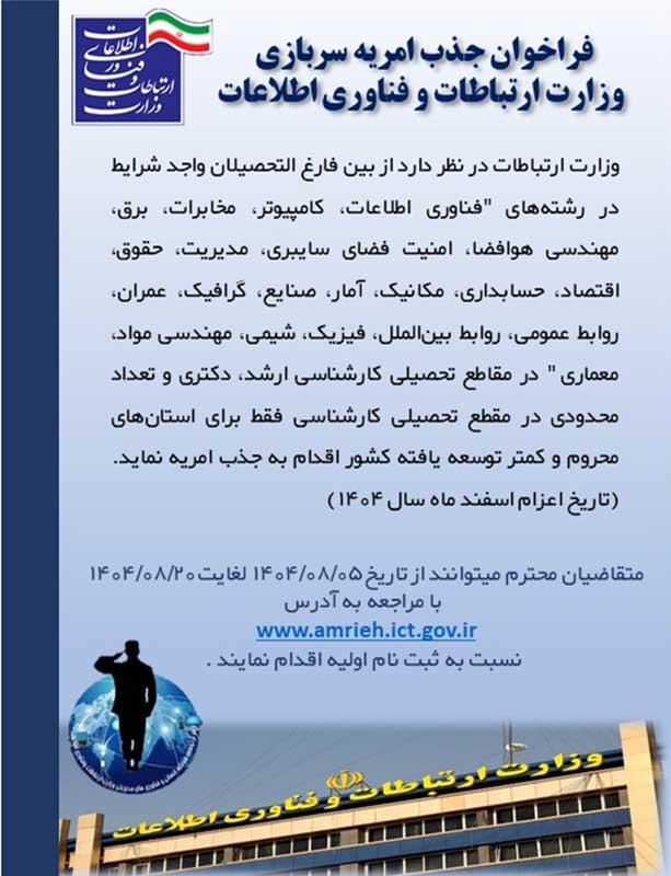 وزارت ارتباطات و فناوری اطلاعات در نظر دارد از بین فارغالتحصیلان واجد شرایط در رشتههای فناوری اطلاعات، حقوق، اقتصاد، رایانه، مدیریت، حسابداری، مکانیک، آمار، مخابرات، صنایع، گرافیک، عمران، برق، روابط عمومی، روابط بینالملل، مهندسی هوافضا، فیزیک، شیمی، مهندسی مواد، معماری و امنیت فضای سایبری در مقاطع تحصیلی کارشناسی ارشد، دکتری و تعداد محدودی در مقطع تحصیلی کارشناسی فقط برای استانهای محروم و کمتر توسعهیافته کشور نسبت به جذب نیروی امریه سربازی اقدام نماید.