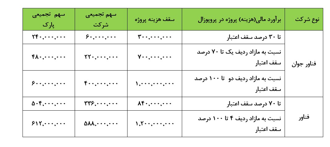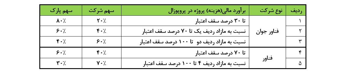 میزان مشارکت پارک و شرکت در اعتبارات پروژه به قرار جدول زیر است: