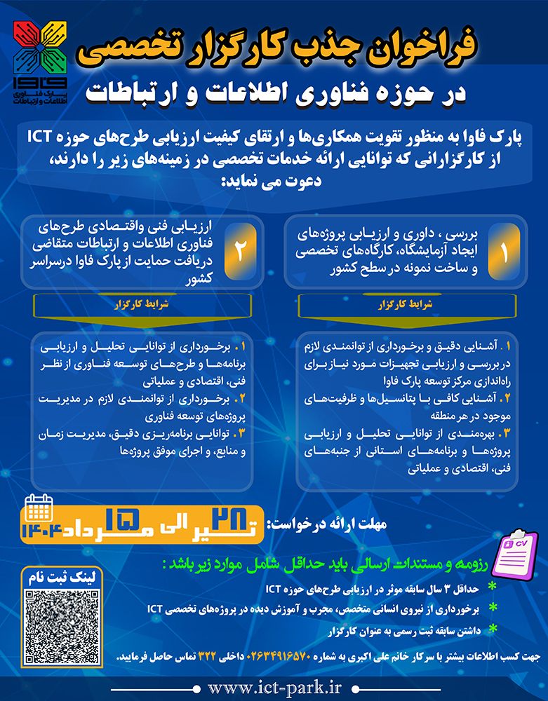 به همین منظور از کلیه شرکتهای توانمند در ارائه خدمات فوق، دعوت به عمل میآید تا در صورت تمایل به همکاری با پارک فاوا، درخواست خود را از طریق ثبتنام در همین سامانه (بخش فراخوان جذب کارگزار تخصصی شبکه تاد) ارسال فرمایند. پس از ارزیابی و تأیید توانمندیها، امکان عضویت آنها در پارک به عنوان کارگزار فراهم خواهد شد.