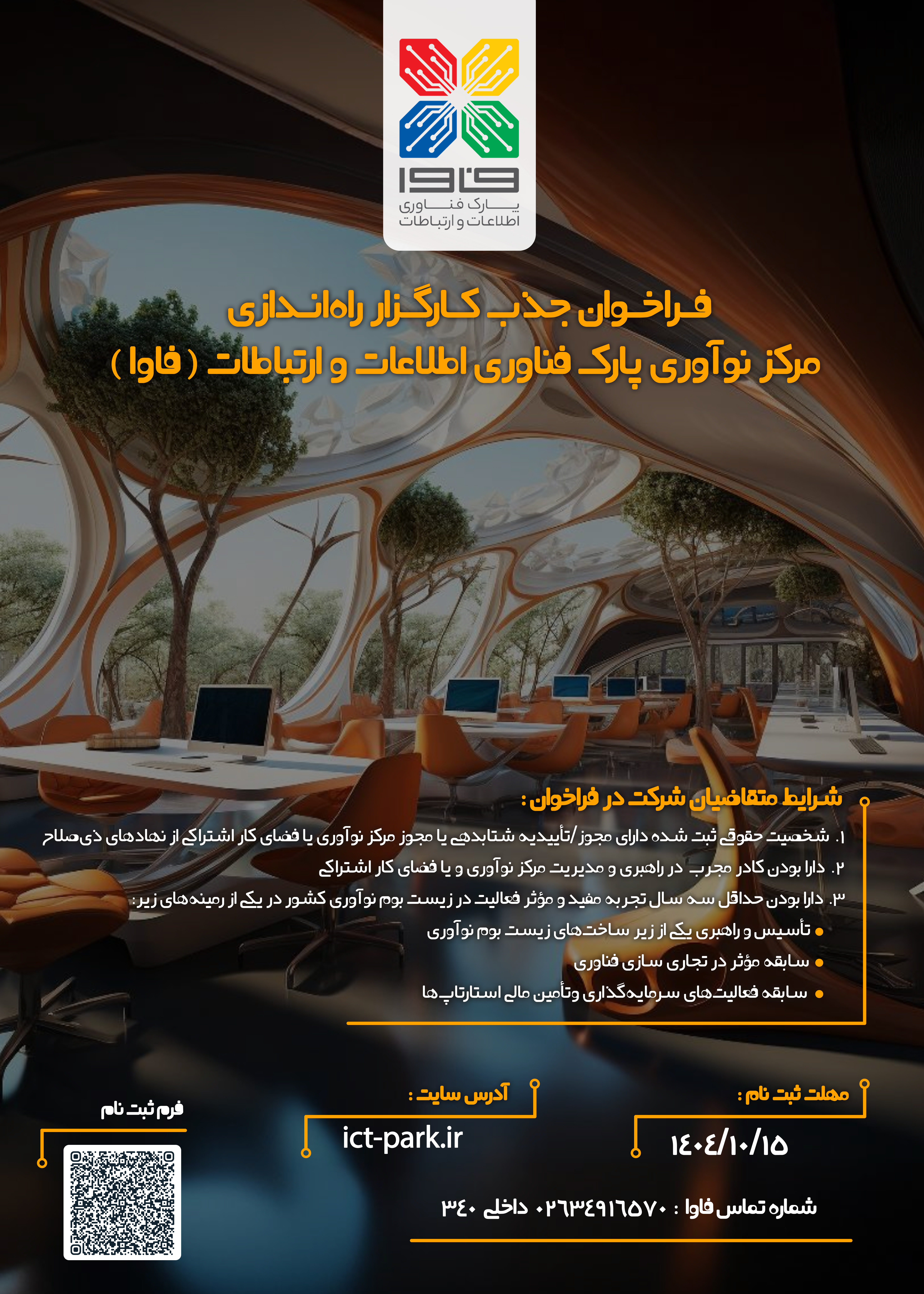 پارک فناوری اطلاعات و ارتباطات (فاوا) در نظر دارد به منظور تجهیز و راهاندازی مرکز نوآوری پارک فاوا اقدام به برگزاری فراخوان جذب مستاجر به شرایط زیر نماید. به همین منظور از کلیه علاقهمندان و واجدین شرایط دعوت میگردد، حداکثر تا تاریخ 1404/10/15 نسبت به مطالعه و تکمیل فایل مذکور و ارسال آن به آدرس پستی کیلومتر ۲۶ اتوبان تهران-کرج، اولین خروجی پس از گرمدره، پارک فناوری اطلاعات و ارتباطات - مرکز توسعه واحدهای فناور اقدام نمایند.